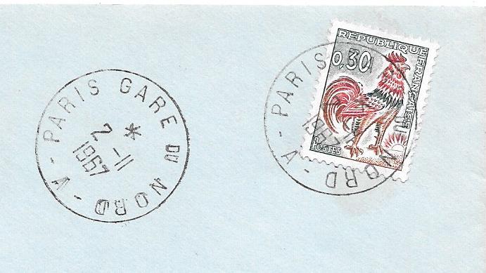 A partir d’ici, j’applique le catalogue Lauthier; suivre le lien pour distinguer les oblitérations entre le A1 et le A9. Pour faire simple, en général, le type A4 court de 1904 à 1947, le type A6 de 1948 à 1950, le type A7 de 1951 au début des années 1960. Vient ensuite le type A8 jusqu’au milieu des années 1960 et arrive le type A9 reconnaissable au numéro du département dans la couronne encore en activité de nos jours. Pour le bureau de poste de la gare du Nord, on rencontre le type A4/A6/A7/A8. Les oblitérations gares de Paris n’ont jamais été codées (ajout du numéro de département), le nom de Paris suffit à lui même.