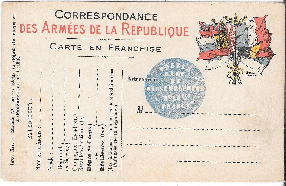 Le courrier militaire est trié puis il transite vers le bureau frontière concerné d’où il quitte le domaine public pour entrer dans la zone des armées, notamment avec l’aide d’un bureau centrale militaire créé à Paris. Ensuite le courrier est prit en charge par la Trésorerie et la poste aux armées. Ce courrier est distribué par les vaguemestres militaires. Par le décret du 03/08/1914, la franchise postale est accordée aux militaires et aux familles de soldats pour les plis de moins de 20g.