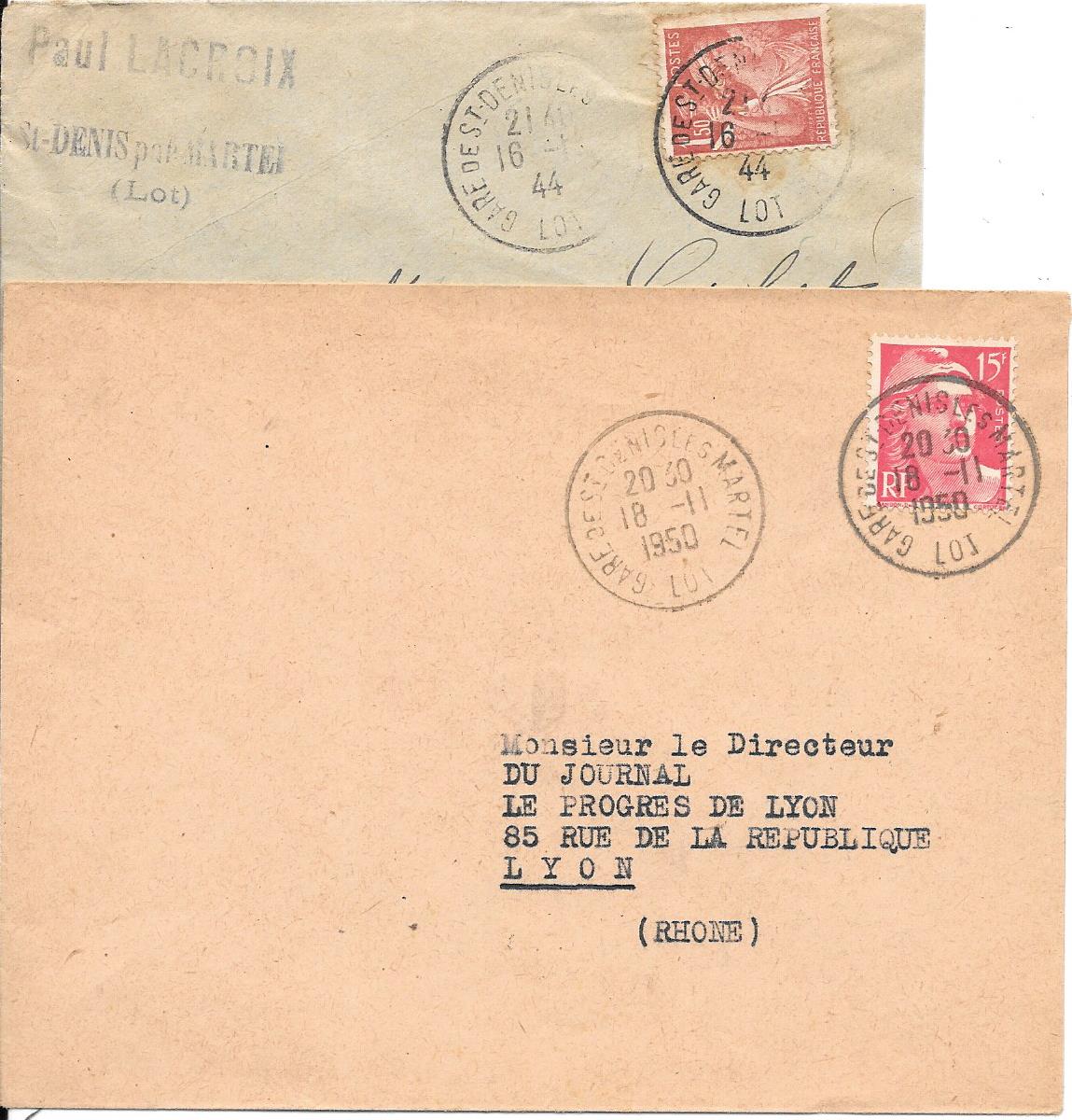 Gare de Saint Denis les Martel mise en service le : bureau-gare de Saint Denis les Martel, vu jusque 1950. Le bureau-gare de Saint Denis les Martels a utilisé comme oblitération manuelle, deux types: 1884, 1904. Devient un entrepôt, signalé ouvert en 1954 et fermé le 01/02/1971.