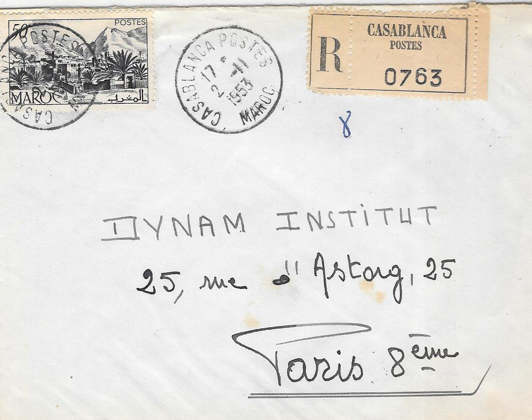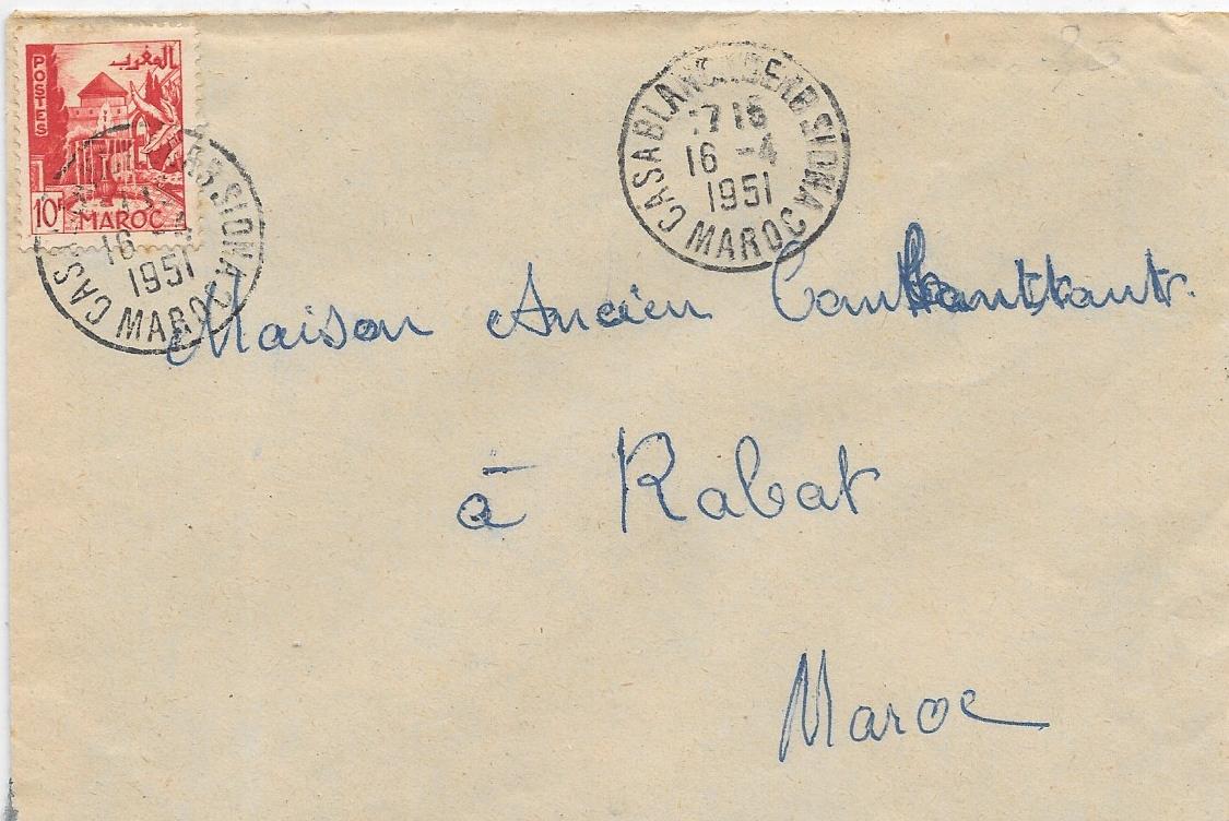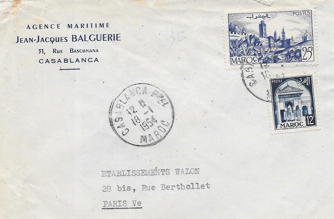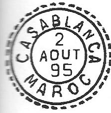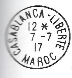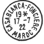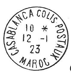Casablanca, bureau de distribution probablement ouvert le 02/01/1893. Les bureaux de poste de Casablanca vont évoluer au gré de la masse de correspondance générée au fil des ans. Ainsi en 1919, le bureau de poste central est devenu un bureau de plein exercice mixte (poste, télégraphe, téléphone). En 1954 la recette centrale se trouvait à l’angle de l’avenue du général d’Aumale et du boulevard de Paris.